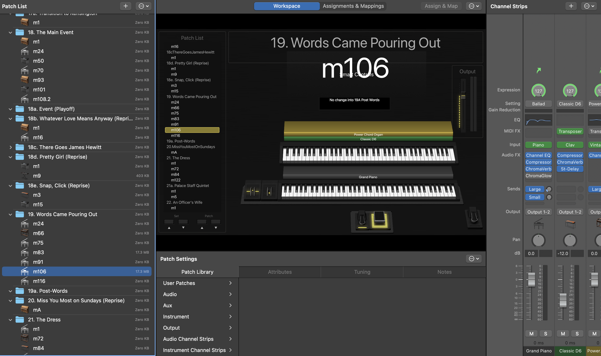 I served as Associate Music Director for Theo Ubique’s production of Diana: The Musical. For this show, I had the opportunity to reorchestrate the show to fit within three players, and creatively made the decision to go with a double keyboard setup. Our Music Director, Carolyn Brady, wanted to lean into a large 80’s sound with heavy synths. We wanted to stay away from using synthetic horns or strings since Mainstage doesn’t synthesize real instruments well. Instead, I leaned into the bombastic nature of the score by using lead sawtooth synths, 80’s pads instead of strings, and if we were to use horns, a Synth Brass patch instead of a imitation of french horns or trumpets.